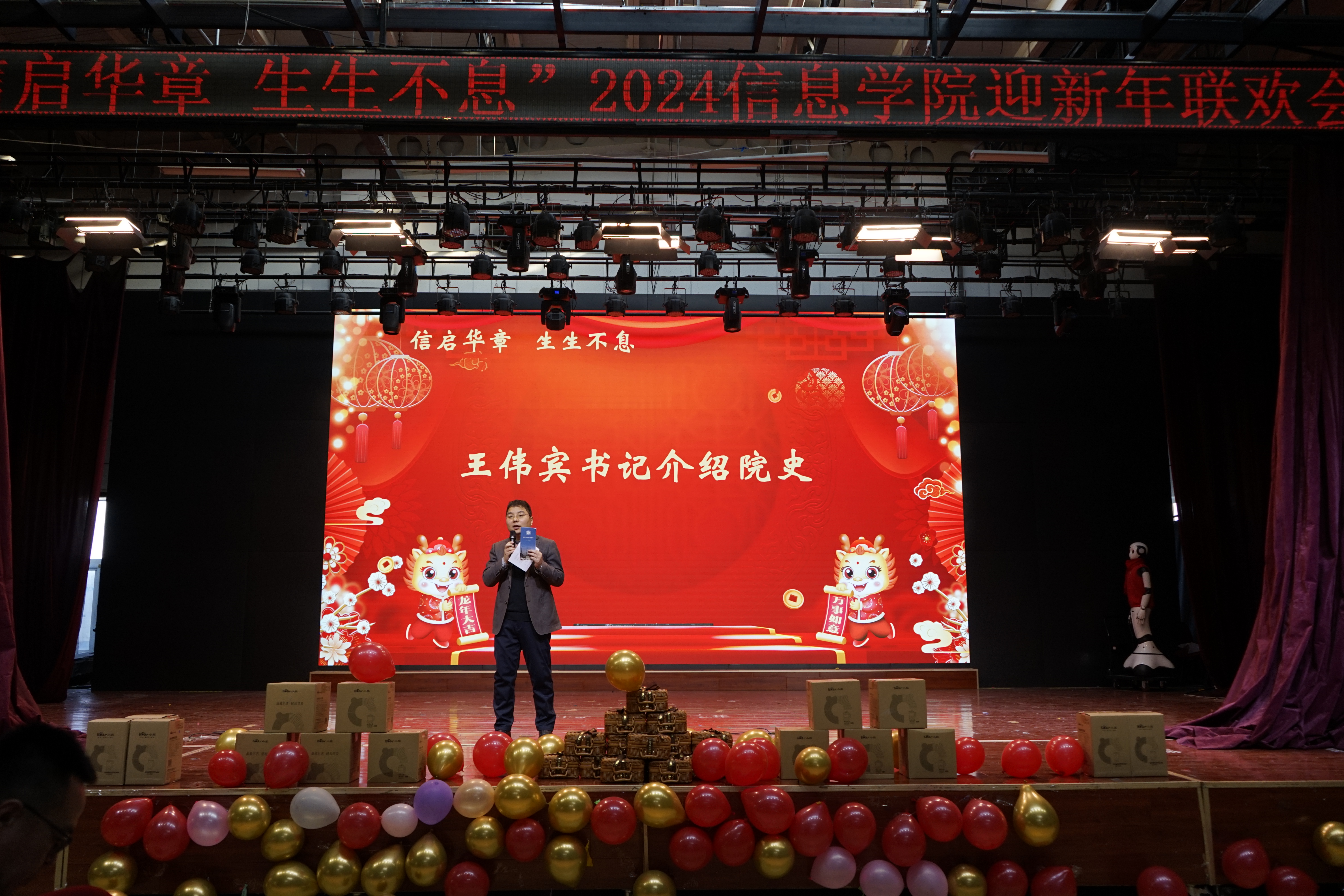 校党委副书记史贞军致新年贺辞。他代表学校向全院教师送去新春的祝福,并对大家一年来全体教职工为学校各项工作的辛勤付出表示感谢。他充分肯定了学院过去一年工作中所取得的各项成绩,并一一列举了诸多教师和学生的先进事迹,他鼓励大家今后要齐心协力,锚定目标,奋勇争先,落实好学校的各项决策部署,努力实现个人和学院的发展与学校同频共振,为学校高水平应用型大学建设做出自己应有的贡献。